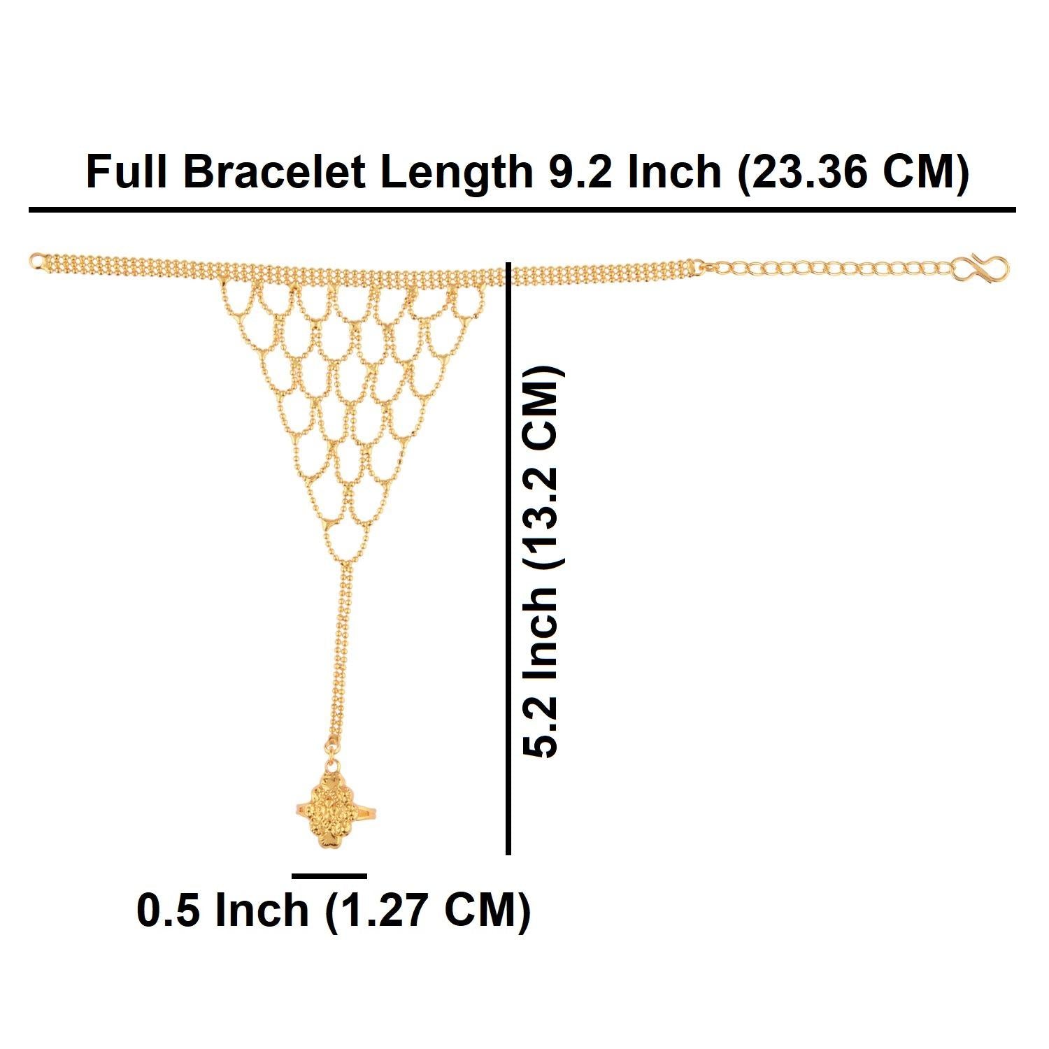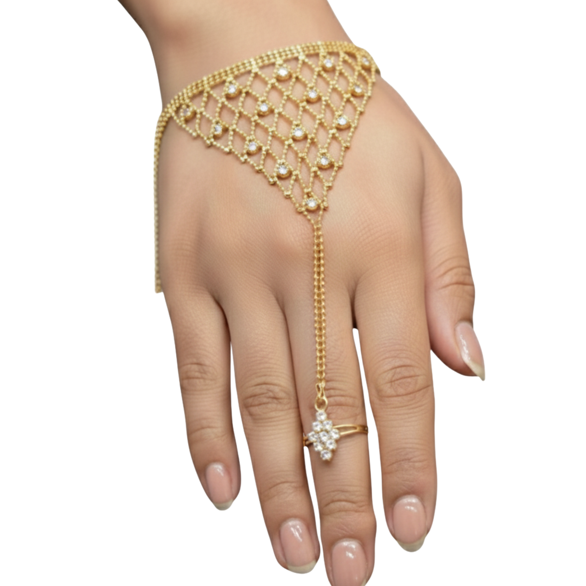 Elevate your look with this stunning gold-plated hand harness featuring a delicate mesh design adorned with shimmering pearl accents. The elegant chain connects seamlessly to a matching floral ring, creating a graceful statement piece perfect for weddings, parties, and special occasions. Lightweight, eye-catching, and beautifully crafted — this accessory adds a touch of royal charm to any outfit.